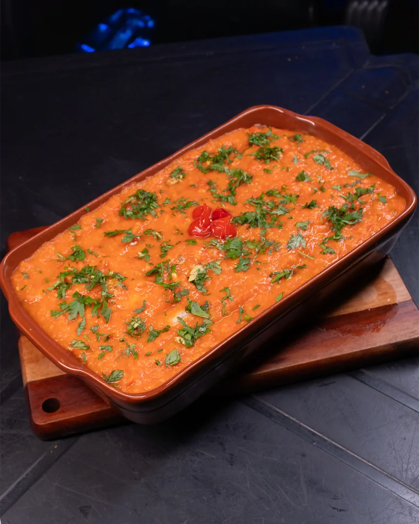 400g de tilápia ao molho urucum, batata frita + 4 acompanhamentos da sua escolha