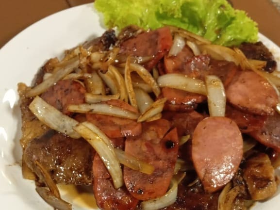(in natura) 400g de filé mignon acebolado, arroz, vinagrete, farofa, mandioca e 300g batata frita